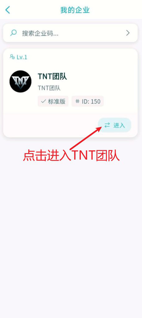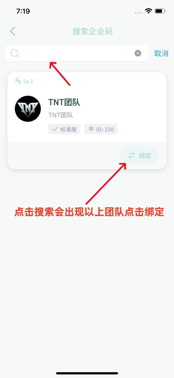 4.搜索框输入企业码【TT047575】搜索TNT团队点击绑定